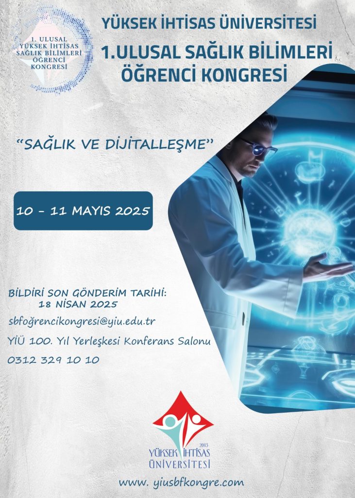 “1. Ulusal Yüksek İhtisas Üniversitesi Sağlık Bilimleri Öğrenci Kongresi” Yüksek İhtisas Üniversitesi Sağlık Bilimleri Fakültesi tarafından 10-11 Mayıs 2025 tarihleri arasında Yüksek İhtisas Üniversitesi 100. Yıl Yerleşkesi Konferans Salonunda düzenlenecektir. https://www.yiusbfkongre.com/